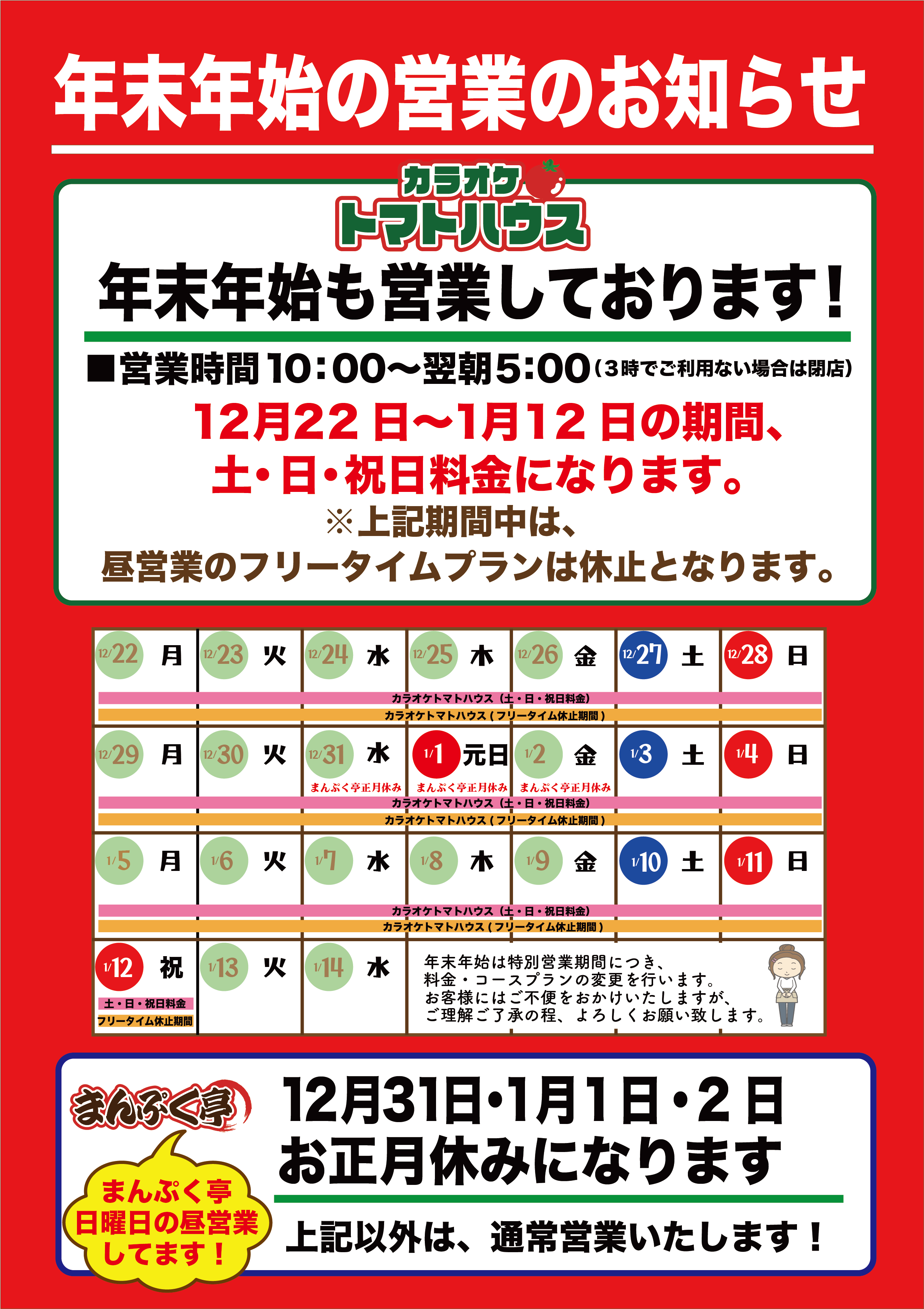 2025.12.22 イベント・フェア 年末年始の営業について 年末年始の営業についてトマトハウスは年末年始も営業しております!1月12日まで、特別営業期間になります。まんぷく亭は、12月31日(大晦日)1月1日・2日お休みをいただきます。 PDFを開く 一覧へもどる